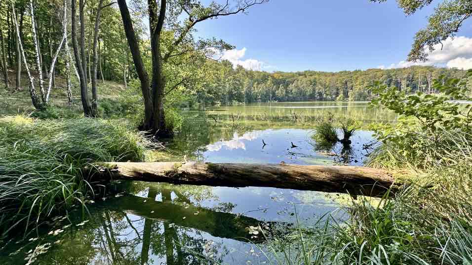 Wir nutzen die Gelegenheit, nach einem Besuch bei der Enkelin am Wochenende nun noch eine Wanderung da in der Nähe zu unternehmen, im wunderschönen Schlaubetal. Schon halb neun beginnen wir unsere Tour auf dem Wanderparkplatz an der Bremsdorfer Mühle. Der blaue Himmel strahlt, aber es ist noch recht frisch. Ein Trupp weißer Enten lagert auf unserem Weg, das sieht schon etwas ungewöhnlich aus. Aber sie lassen sich nicht von uns stören. Eine kleine Modellmühle klappert mit ihrem drehenden Mühlenrad, kurz danach noch eine zweite. Die Schlaube begleitet unseren Weg, einfach idyllisch. In ein paar Wochen wird es hier im bunten Herbstkleid noch schöner aussehen. Leider ist die Zeit des lauten Vogelgezwitschers zu Ende. Nur ein Schwarzspecht schimpft immer mal wieder und ein Bussard kreist irgendwo oben, wir hören ihn rufen. Wir laufen einen großen Teil „doppelt“, erst hin, dann zurück. Dazwischen eine Schleife mit einer Mittagsrast am Ziskensee, auf einer Uferbank in der Sonne, wie für uns gemacht. Es ist einfach nur schön. Und erst fast zum Schluss unserer Tour begegnen uns einige weitere Wanderer und ein Mountainbiker, vorher hatten wir das gesamte Gebiet für uns alleine. Ein Angler am Kleinen Treppelsee sitzt ebenso einsam, nur wir stören seine Ruhe, als wir uns über umgestürzte Bäume kämpfen. Noch schnell durch einen schmalen Wiesen und dann sind wir im Ziel. Schön war’s…