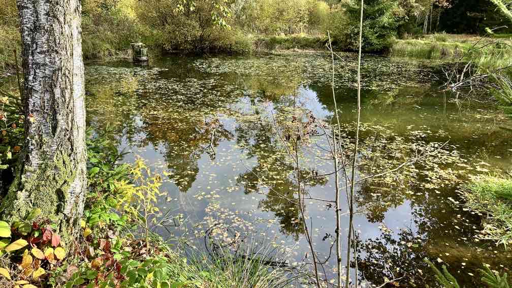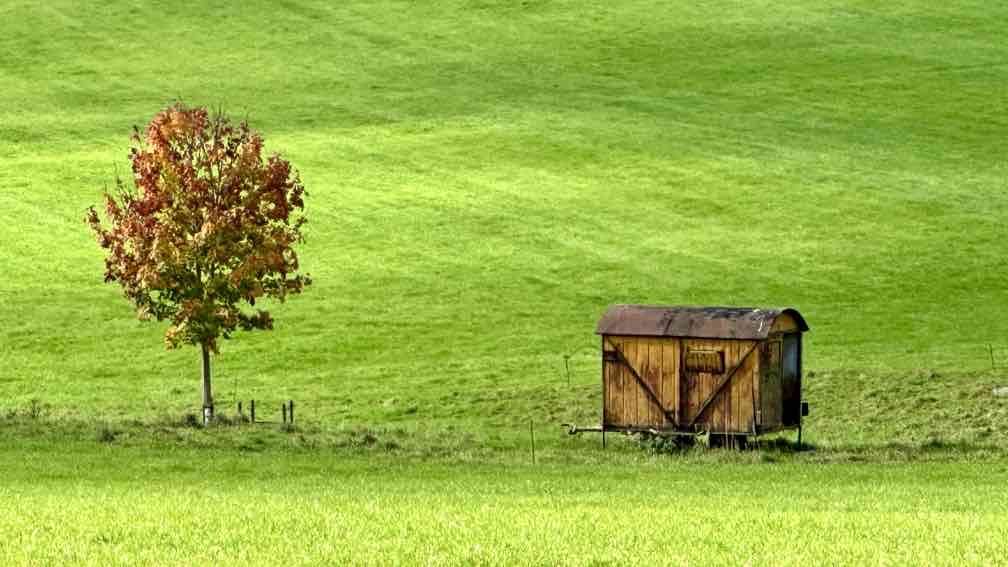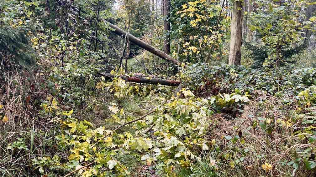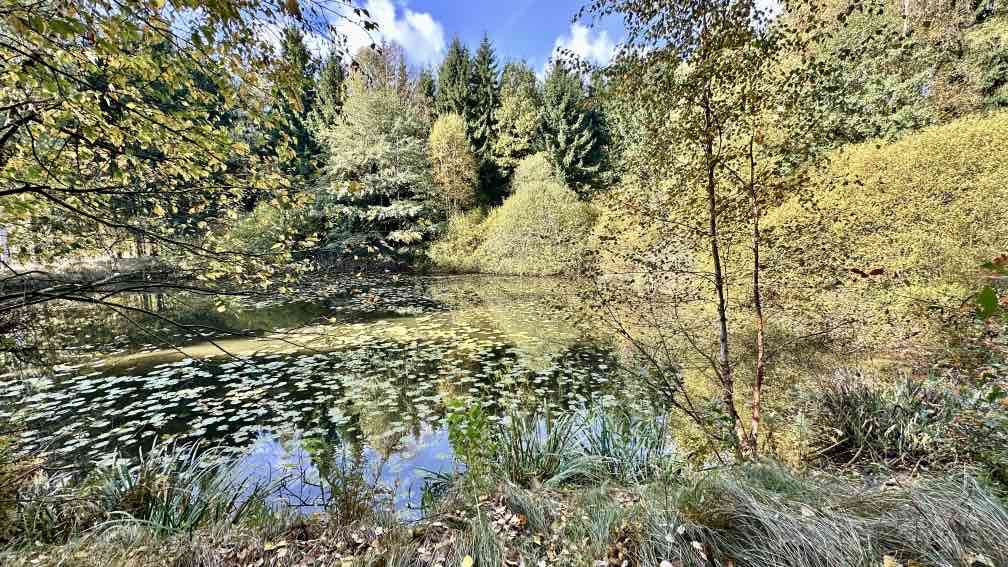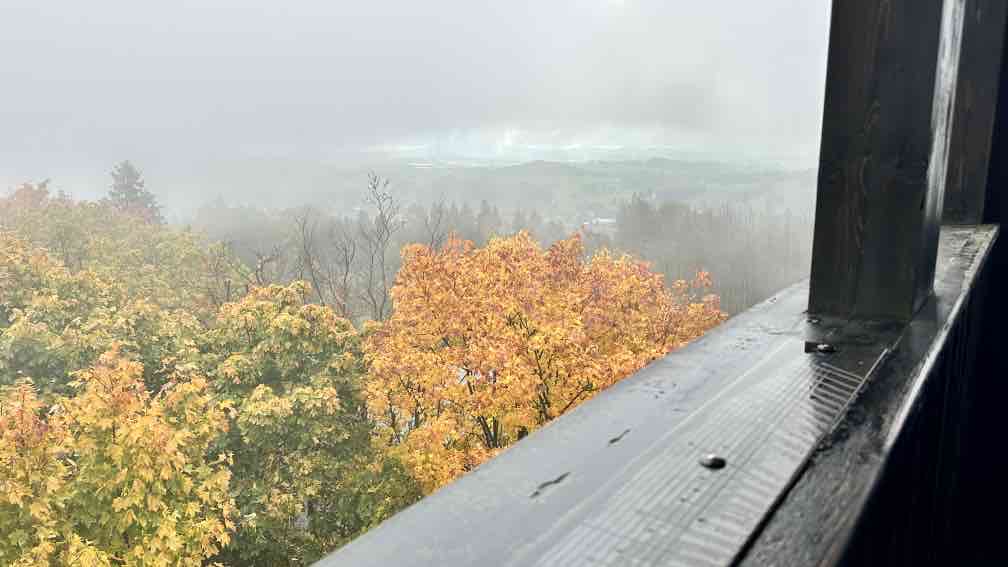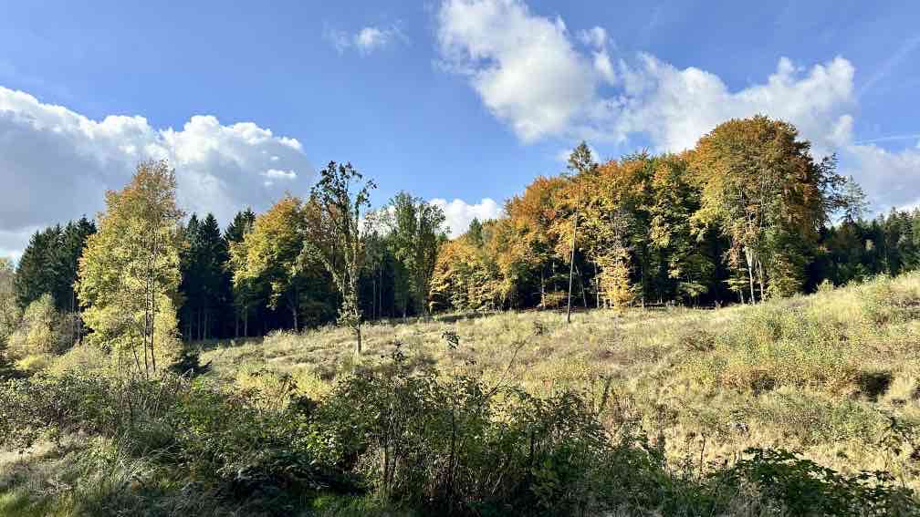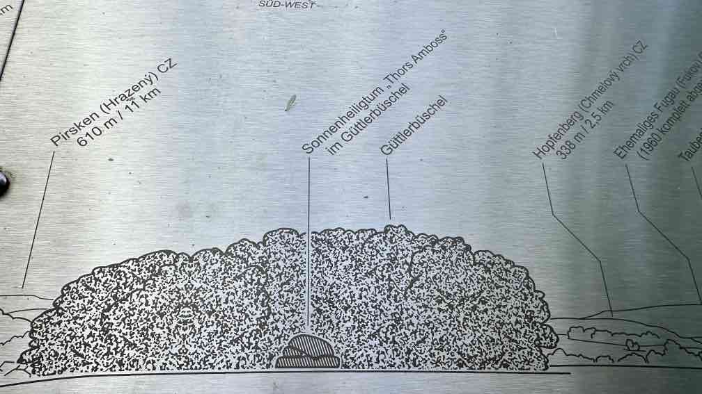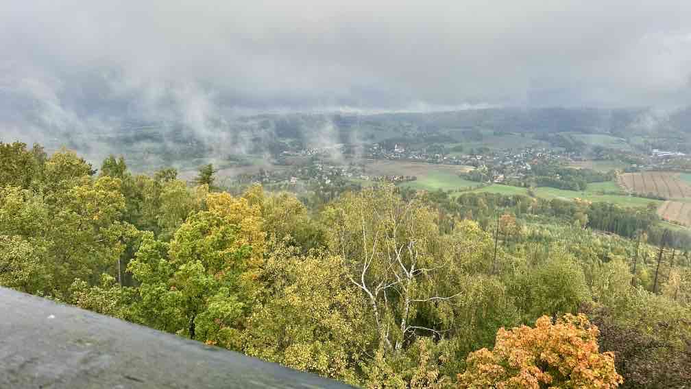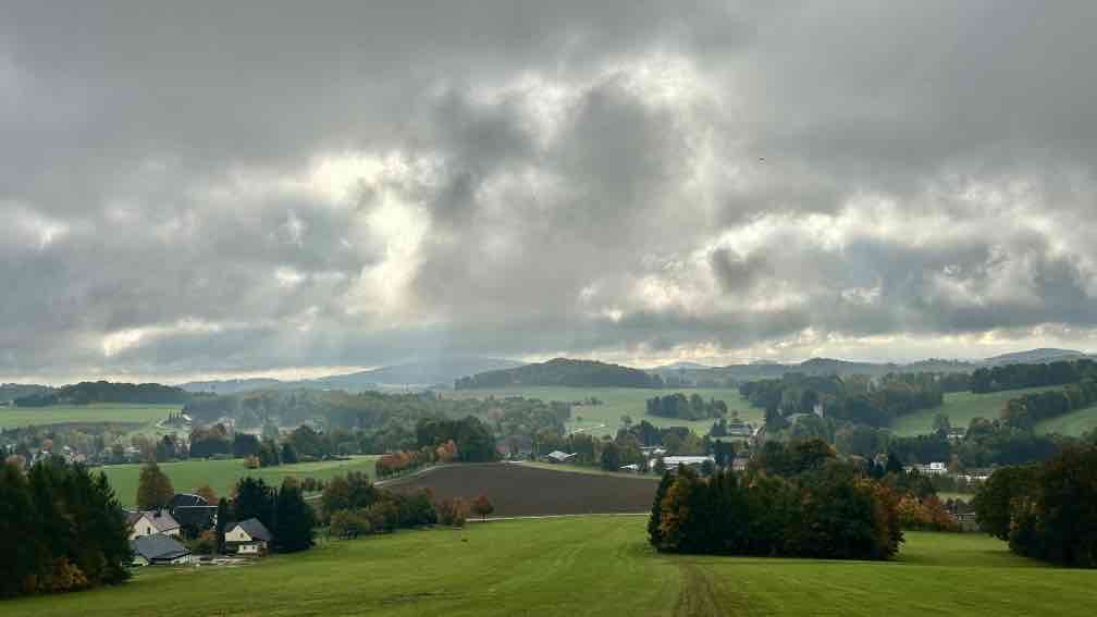 In der Hoffnung, der Aussichtsturm möge geschlossen sein, führt mich mein erster Weg heute dahin. Aber die Tür ist offen und so erklimme ich die (für mich) unendlich vielen Stufen in die Höhe. UND trete dann tatsächlich hinaus ins Freie. Geschafft, Trommelwirbel! Drei Seiten der Aussicht liegen im Nebel, der langsam davon zieht. Aber die vierte Seite bietet mir eine wunderschöne Weitsicht. Das ist wie ein Morgengruß (ohne Sonne und ohne Yoga) – ich genieße den Blick eine lange Weile, bevor ich mich mit zitternden Knien dem Abstieg widme. Auch das schaffe ich. Nun kann ich meine heutige, etwas kürzere Tour beginnen. Noch wirken die Wolken bedrohlich, aber immer wieder schaut auch die Sonne hindurch. Oft bleibe ich da stehen, wo es einen grandiosen Blick in die Ferne gibt. Sicher nicht vergleichbar mit einem Hochgebirge, aber genauso erhebend. Ich sauge es auf. Der Weg ist absolut einsam, außer ein paar Waldarbeitern sehe ich niemanden. Ach doch, eine Bikerin, die an mir vorüber rauscht. Und ich höre den Eichelhäher schimpfen, die Tannenmeise ziepen und das „Lachen“ eines Grünspechtes. Die Wege sind heute wieder absolut abwechslungsreich, von schmalen Pfaden bis hin zu breiten Schotterwegen ist alles mit dabei. Aber auch quietschnasse Wiesenpfade mit kniehohen Gräsern darf/muss ich laufen – Schuhe und Hosenbeine sind danach ebenso quietschnass. Aber das macht nichts, ich habe heute einen Balkon in meiner Ferienwohnung, da trocknet alles im strahlenden Sonnenschein am Nachmittag …