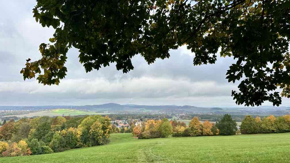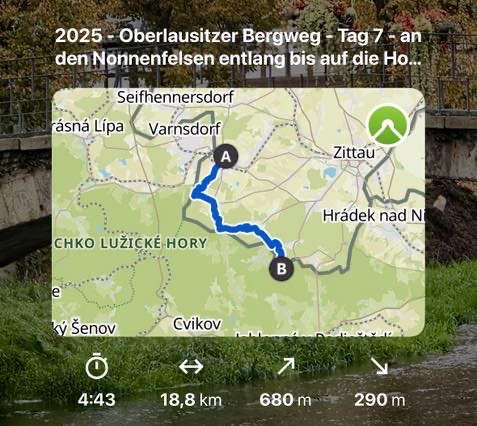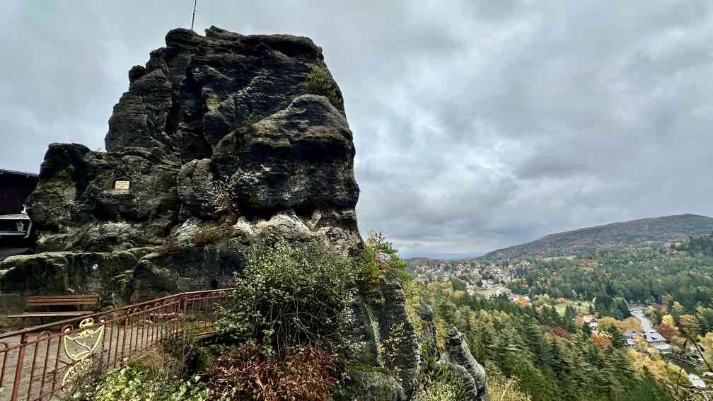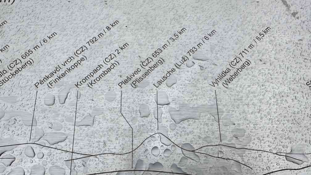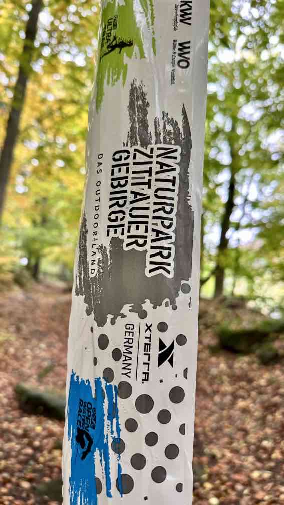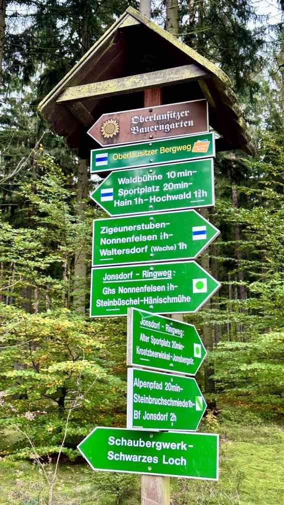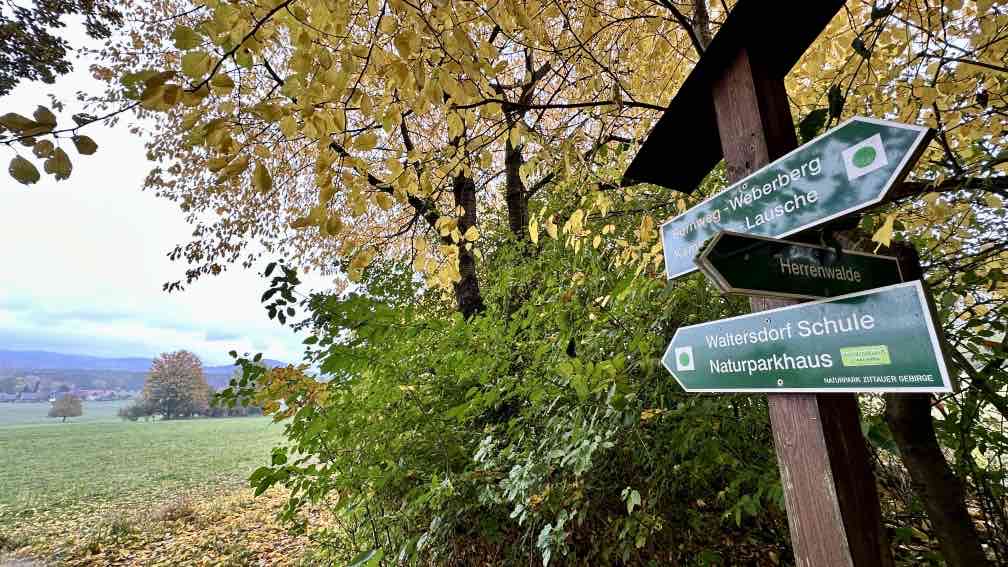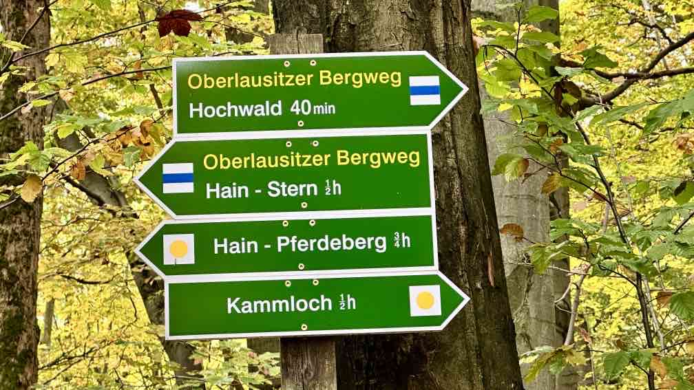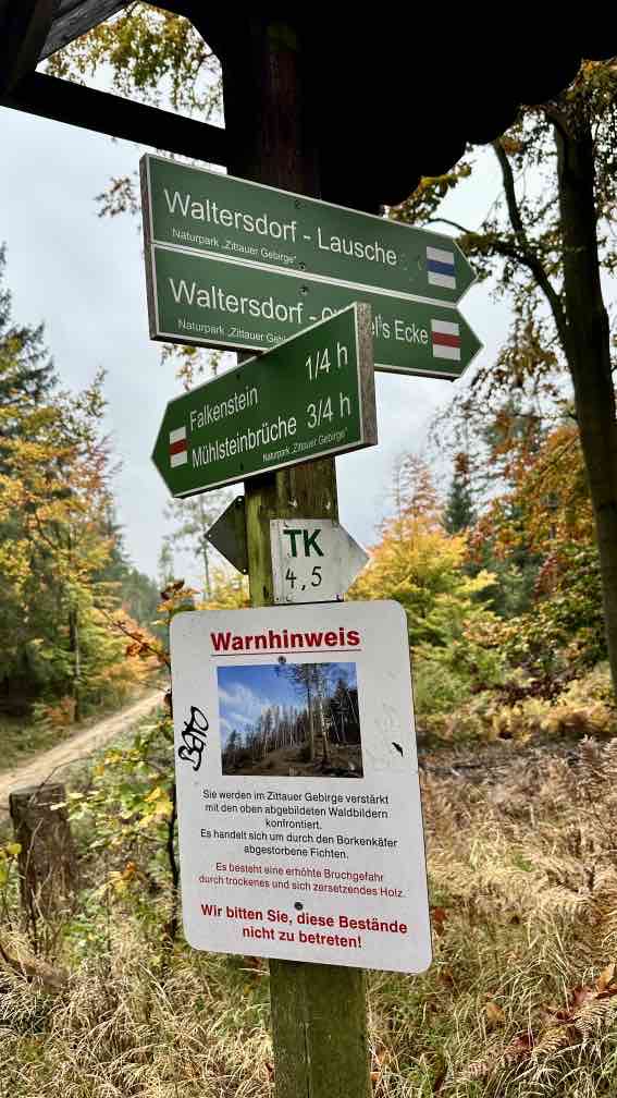 Die Königsetappe wird heute leider nicht ganz so königlich. Das liegt daran, dass der Wald gekalkt wird – aus der Luft – und damit einige Hauptwege oberhalb von Waltersdorf gesperrt sind. Ich muss deshalb die Tour etwas umplanen und kurz vorm Oberen und Unteren Bornweg drehe ich ab und es geht am Wald- und Wiesenrand durchs „Bankenviertel“ 😅 hinunter nach Waltersdorf. Damit entgeht mir leider der Kammweg, schade. Aber man sollte immer alles positiv sehen, also – ich erspare mir einige Höhenmeter und zwei bis drei Kilometer. Mein Weg führt mich dann wieder hinauf, vorbei am Butterberg und schließlich biege ich am Hohlsteinweg zurück auf „meinen“ Oberlausitzer Bergweg ein. An der kleinen Rosenthaler Schutzhütte lege ich eine Pause ein – und werde vom Hubschrauber überrascht. Der Kalkbehälter schwebt fast über mir. Hier scheint wohl ein Lagerplatz zu sein. Auch ein großer LKW kommt plötzlich ran. Ich schultere den Rucksack und ziehe schnell weiter. Und zwar hoch zu den Nonnenfelsen, durch Felsenschluchten wieder hinab und an den Jonsdorfer Gondelteich. Es gibt keine Jahreszeit, in der man nicht ein Softeis essen kann, sage ich mir und warte genießend auf der überdachten Terrasse einen kleinen Schauer ab. Von hier geht es nun bergab und bergauf entlang des Sagenpfades rüber bis nach Hain und dann? Dann steige ich rund 300 Höhenmeter hinauf zum heutigen Ziel, zur Hochwaldbaude hinauf, schnaufend mit vielen kleinen Pausen. Kurzer Abstecher vorher noch zum Hochwaldturm, es nieselt, ich spar mir den Aufstieg und laufe rüber zur Baude. Von der Terrasse aus – über die übrigens genau die deutsch-tschechische Grenze verläuft – habe ich dann einen fantastischen Weitblick, trotz nicht so schönem Wetter. Seitlich sehe ich viele Gipfel, die Lausche – mit 793 m der höchste Gipfel hier und sogar der höchste östlich der Elbe (!) – außerdem den tschechischen Rollberg (696 m), Tölzberg (591 m), den runden Limberg (665 m) fast in der Nähe und viele viele mehr. Woher ich das weiß? Von vielen Infotafeln, die die sichtbaren Berge der Umgebung gut darstellen und mir die passenden Daten liefern. Der Wind ist kalt und so reiße ich mich los und gehe schnell in die warme Baude. Dabei fällt mir auf, dass ich bisher immer nur im Oktober hier war, nun zum dritten Mal …