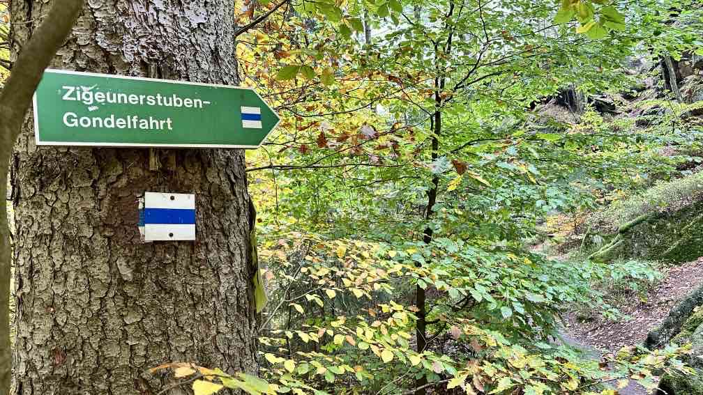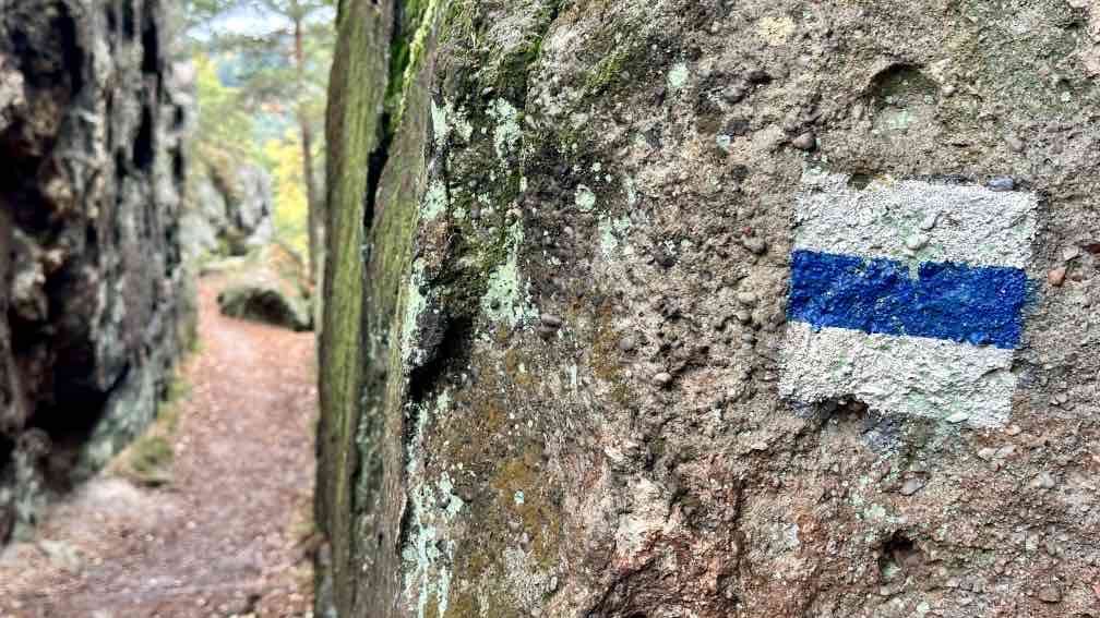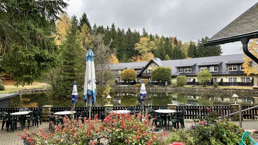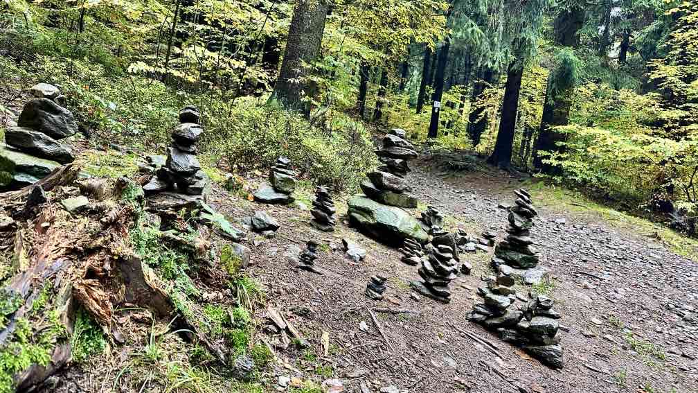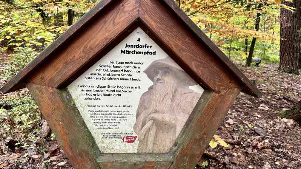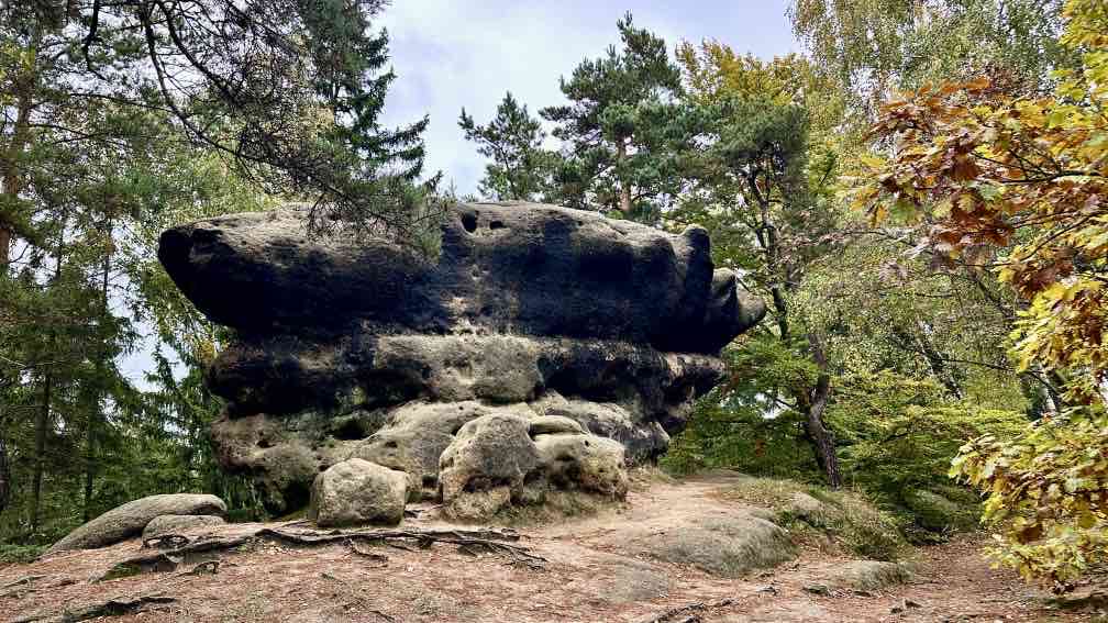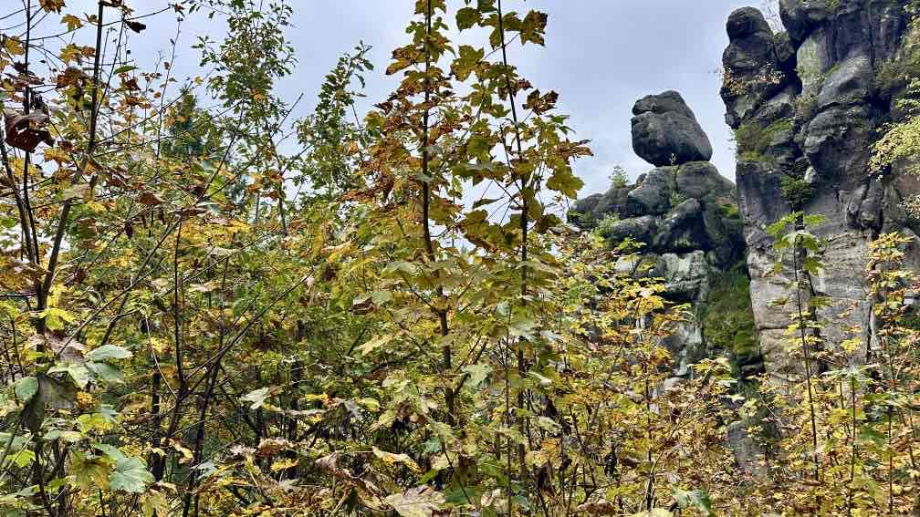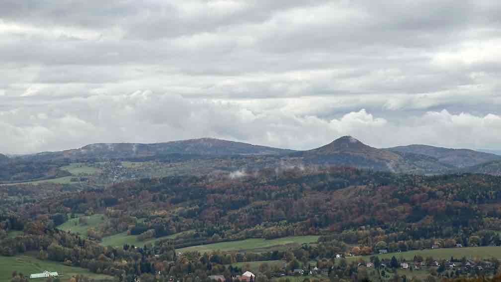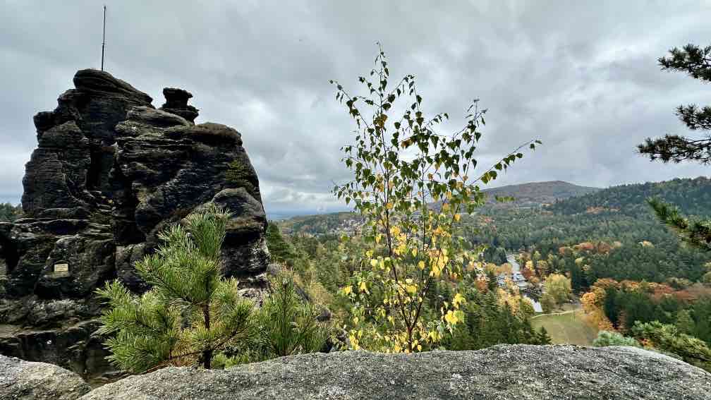 Die Königsetappe wird heute leider nicht ganz so königlich. Das liegt daran, dass der Wald gekalkt wird – aus der Luft – und damit einige Hauptwege oberhalb von Waltersdorf gesperrt sind. Ich muss deshalb die Tour etwas umplanen und kurz vorm Oberen und Unteren Bornweg drehe ich ab und es geht am Wald- und Wiesenrand durchs „Bankenviertel“ 😅 hinunter nach Waltersdorf. Damit entgeht mir leider der Kammweg, schade. Aber man sollte immer alles positiv sehen, also – ich erspare mir einige Höhenmeter und zwei bis drei Kilometer. Mein Weg führt mich dann wieder hinauf, vorbei am Butterberg und schließlich biege ich am Hohlsteinweg zurück auf „meinen“ Oberlausitzer Bergweg ein. An der kleinen Rosenthaler Schutzhütte lege ich eine Pause ein – und werde vom Hubschrauber überrascht. Der Kalkbehälter schwebt fast über mir. Hier scheint wohl ein Lagerplatz zu sein. Auch ein großer LKW kommt plötzlich ran. Ich schultere den Rucksack und ziehe schnell weiter. Und zwar hoch zu den Nonnenfelsen, durch Felsenschluchten wieder hinab und an den Jonsdorfer Gondelteich. Es gibt keine Jahreszeit, in der man nicht ein Softeis essen kann, sage ich mir und warte genießend auf der überdachten Terrasse einen kleinen Schauer ab. Von hier geht es nun bergab und bergauf entlang des Sagenpfades rüber bis nach Hain und dann? Dann steige ich rund 300 Höhenmeter hinauf zum heutigen Ziel, zur Hochwaldbaude hinauf, schnaufend mit vielen kleinen Pausen. Kurzer Abstecher vorher noch zum Hochwaldturm, es nieselt, ich spar mir den Aufstieg und laufe rüber zur Baude. Von der Terrasse aus – über die übrigens genau die deutsch-tschechische Grenze verläuft – habe ich dann einen fantastischen Weitblick, trotz nicht so schönem Wetter. Seitlich sehe ich viele Gipfel, die Lausche – mit 793 m der höchste Gipfel hier und sogar der höchste östlich der Elbe (!) – außerdem den tschechischen Rollberg (696 m), Tölzberg (591 m), den runden Limberg (665 m) fast in der Nähe und viele viele mehr. Woher ich das weiß? Von vielen Infotafeln, die die sichtbaren Berge der Umgebung gut darstellen und mir die passenden Daten liefern. Der Wind ist kalt und so reiße ich mich los und gehe schnell in die warme Baude. Dabei fällt mir auf, dass ich bisher immer nur im Oktober hier war, nun zum dritten Mal …