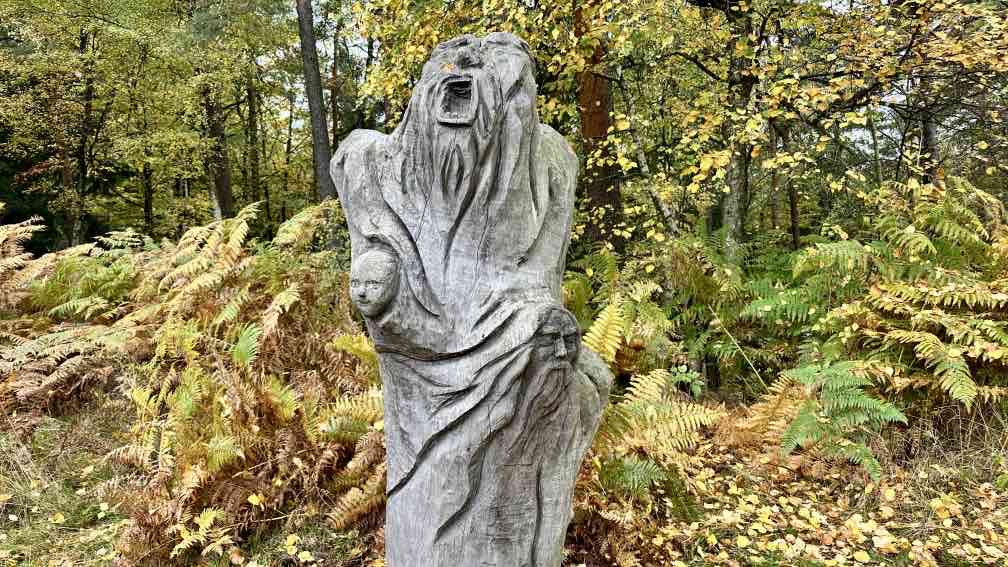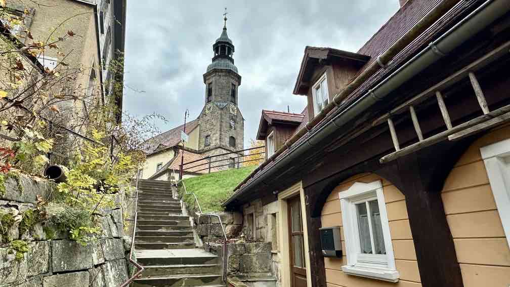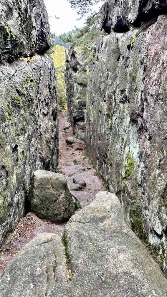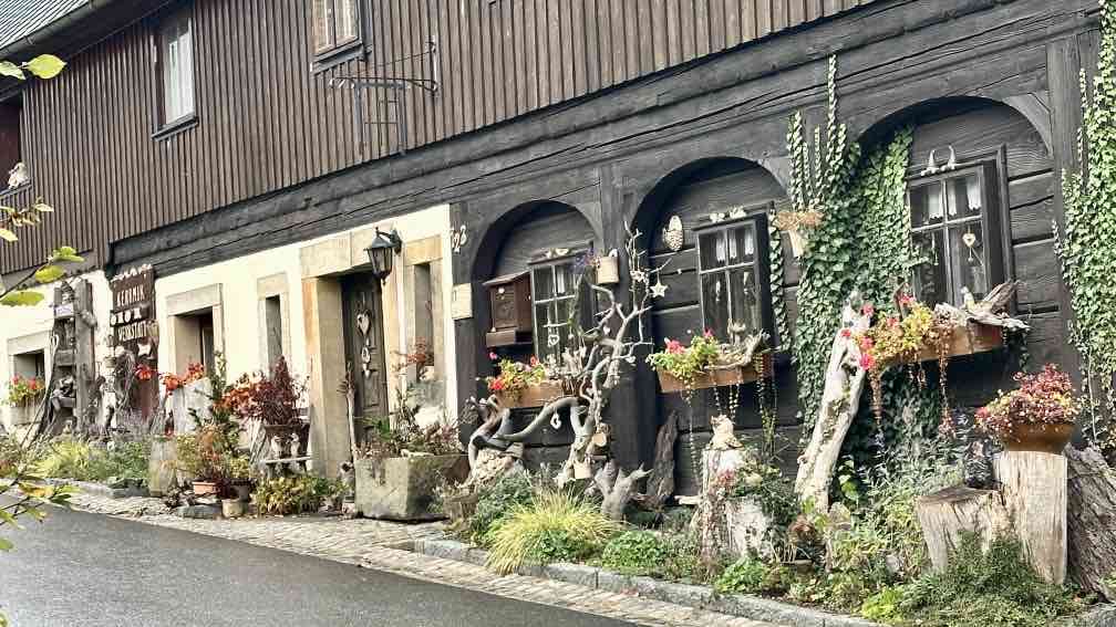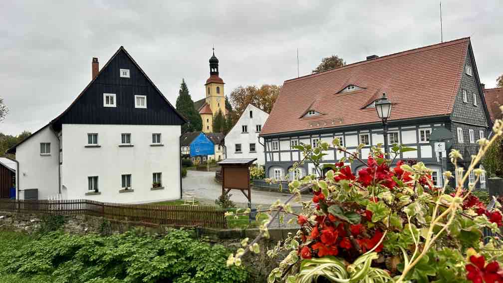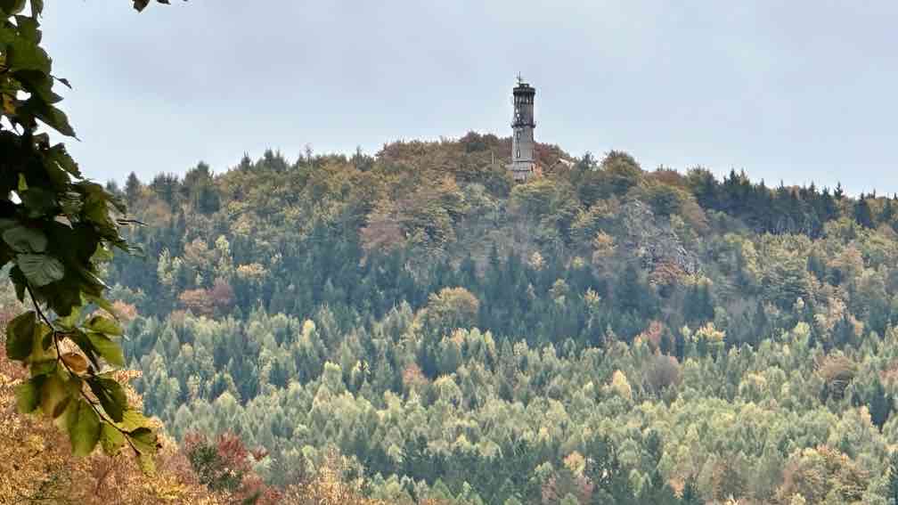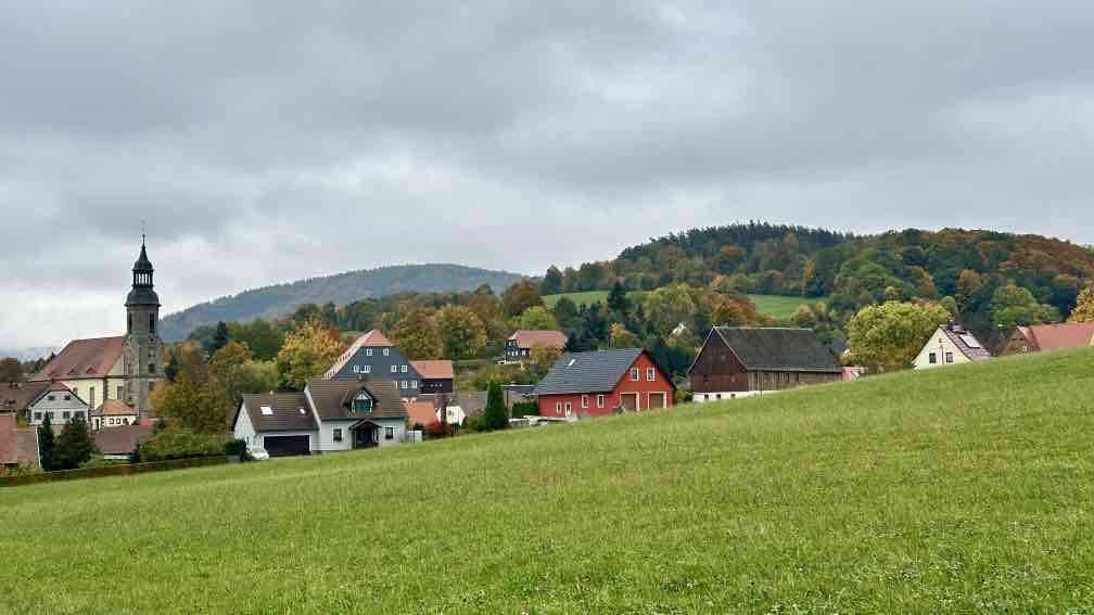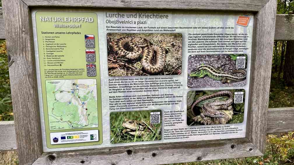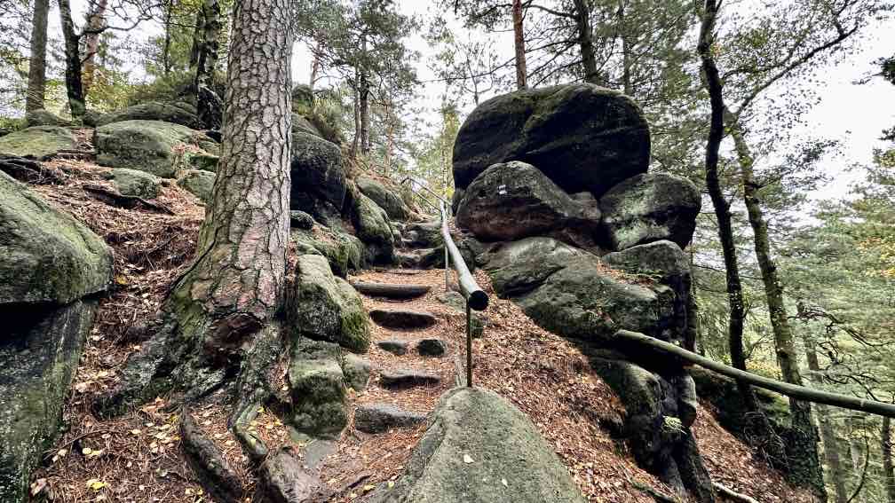 Die Königsetappe wird heute leider nicht ganz so königlich. Das liegt daran, dass der Wald gekalkt wird – aus der Luft – und damit einige Hauptwege oberhalb von Waltersdorf gesperrt sind. Ich muss deshalb die Tour etwas umplanen und kurz vorm Oberen und Unteren Bornweg drehe ich ab und es geht am Wald- und Wiesenrand durchs „Bankenviertel“ 😅 hinunter nach Waltersdorf. Damit entgeht mir leider der Kammweg, schade. Aber man sollte immer alles positiv sehen, also – ich erspare mir einige Höhenmeter und zwei bis drei Kilometer. Mein Weg führt mich dann wieder hinauf, vorbei am Butterberg und schließlich biege ich am Hohlsteinweg zurück auf „meinen“ Oberlausitzer Bergweg ein. An der kleinen Rosenthaler Schutzhütte lege ich eine Pause ein – und werde vom Hubschrauber überrascht. Der Kalkbehälter schwebt fast über mir. Hier scheint wohl ein Lagerplatz zu sein. Auch ein großer LKW kommt plötzlich ran. Ich schultere den Rucksack und ziehe schnell weiter. Und zwar hoch zu den Nonnenfelsen, durch Felsenschluchten wieder hinab und an den Jonsdorfer Gondelteich. Es gibt keine Jahreszeit, in der man nicht ein Softeis essen kann, sage ich mir und warte genießend auf der überdachten Terrasse einen kleinen Schauer ab. Von hier geht es nun bergab und bergauf entlang des Sagenpfades rüber bis nach Hain und dann? Dann steige ich rund 300 Höhenmeter hinauf zum heutigen Ziel, zur Hochwaldbaude hinauf, schnaufend mit vielen kleinen Pausen. Kurzer Abstecher vorher noch zum Hochwaldturm, es nieselt, ich spar mir den Aufstieg und laufe rüber zur Baude. Von der Terrasse aus – über die übrigens genau die deutsch-tschechische Grenze verläuft – habe ich dann einen fantastischen Weitblick, trotz nicht so schönem Wetter. Seitlich sehe ich viele Gipfel, die Lausche – mit 793 m der höchste Gipfel hier und sogar der höchste östlich der Elbe (!) – außerdem den tschechischen Rollberg (696 m), Tölzberg (591 m), den runden Limberg (665 m) fast in der Nähe und viele viele mehr. Woher ich das weiß? Von vielen Infotafeln, die die sichtbaren Berge der Umgebung gut darstellen und mir die passenden Daten liefern. Der Wind ist kalt und so reiße ich mich los und gehe schnell in die warme Baude. Dabei fällt mir auf, dass ich bisher immer nur im Oktober hier war, nun zum dritten Mal …