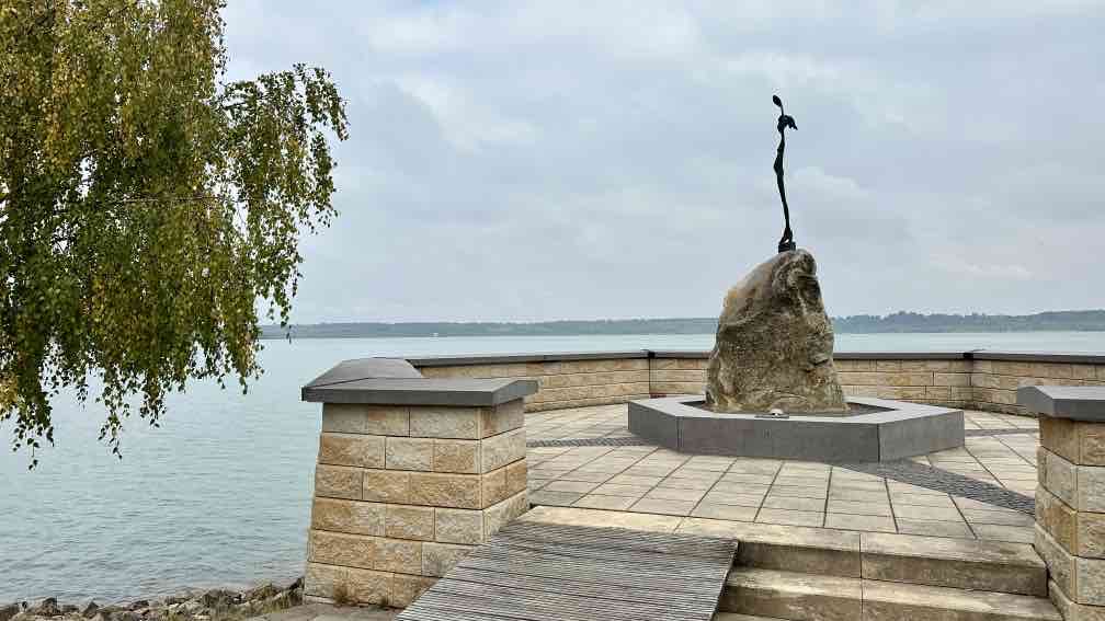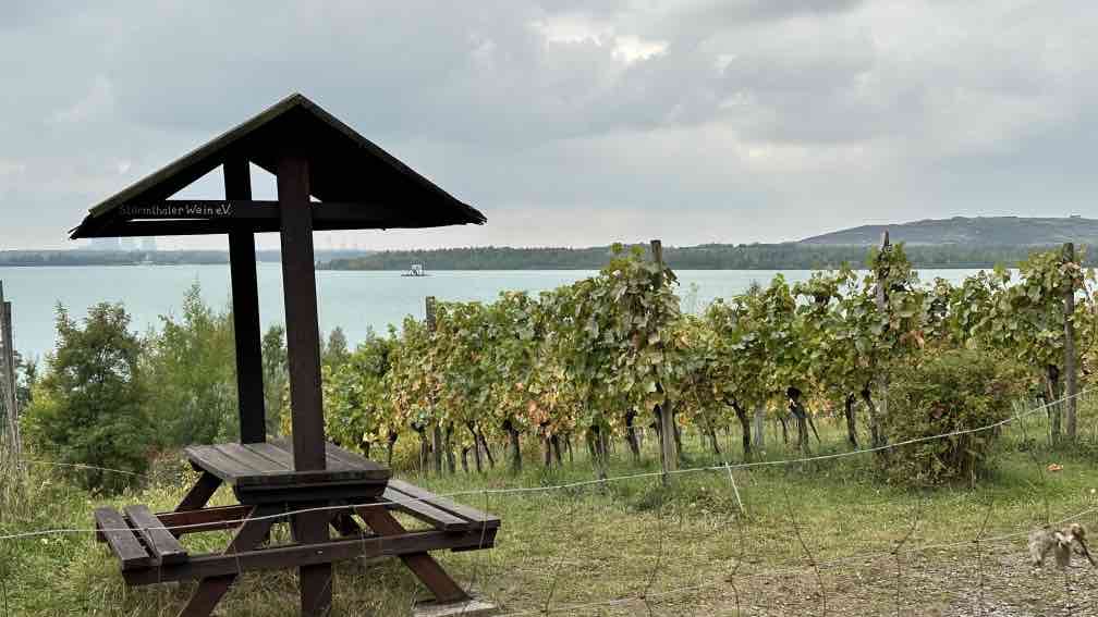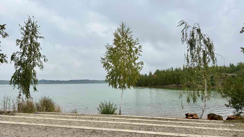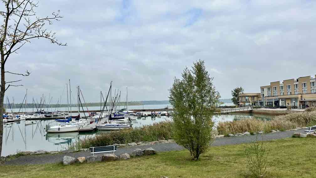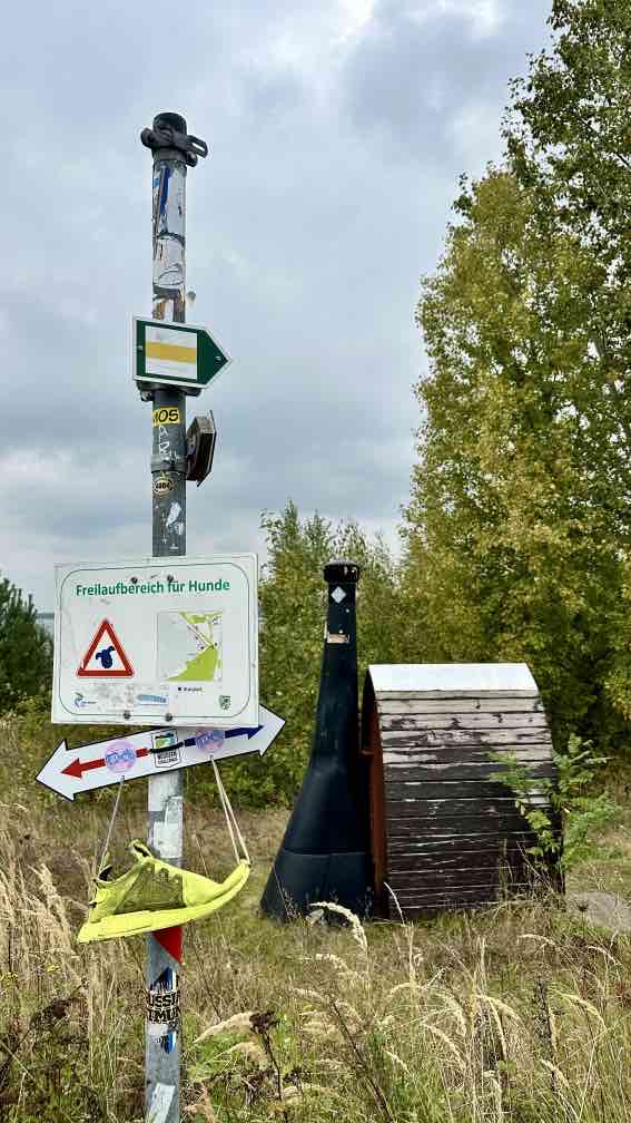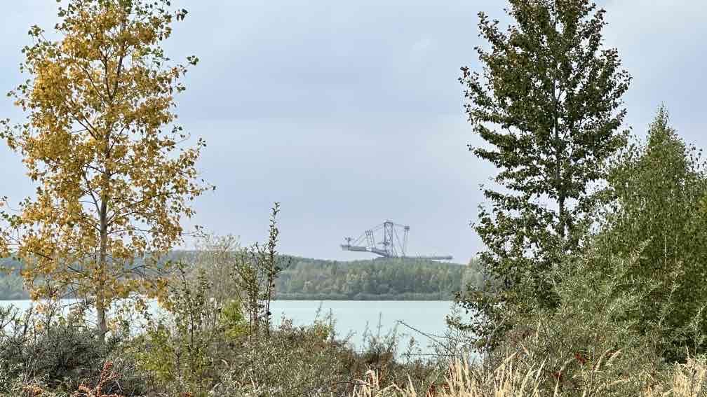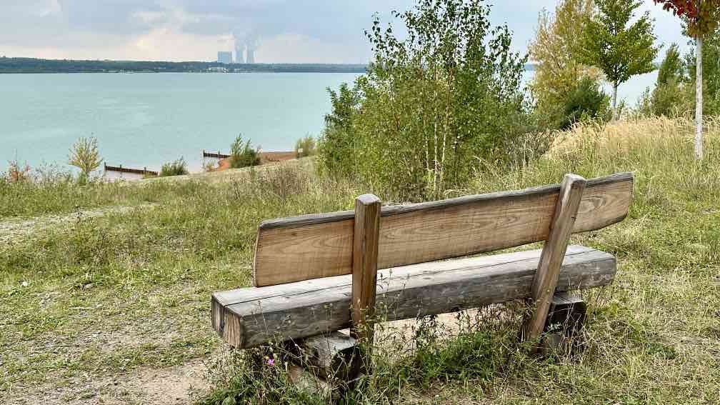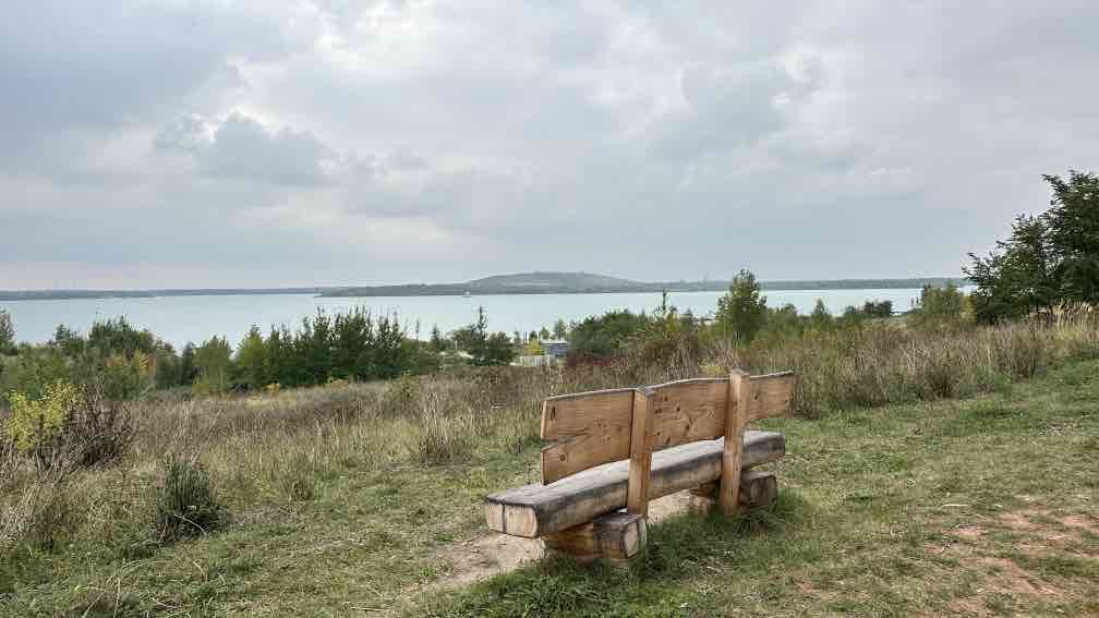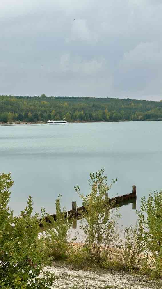 „Gefahrenabwehrmaßnahme“! Auch hier scheint es also Sanierungsmaßnahmen zu geben. Ich beginne einen Umweg, später gibt es die nächste Sperrung. Umleitung für Radfahrer und Fußgänger. Und so laufe ich eine weite Strecke über Felder, über die Autobahnbrücke, immer auf Asphalt oder Split. Und erst nachdem ich schon die Hälfte der heutigen Tour geschafft habe, gestattet mir der See, fast direkt neben ihm zu laufen. Schade, dass es heute so diesig ist, feuchte Luft, keine Sonne. Das hindert mich aber nicht, im Hafen von Lagovida auf einer Bank eine schöne lange Pause einzulegen. Danach bin ich allerdings arg durchgefroren, ziehe eine weitere Jacke aus dem Rucksack über. Mich überholen oft Radfahrer, aber Wanderer sehe ich keine. Dafür erkenne ich in der Ferne das Kraftwerk Lippendorf, die Vineta auf dem See – sie symbolisiert die verlorene Magdeborner Kirche und ist ein schwimmendes Mahnmal, aber auch ein Event-Ort für Hochzeiten und Kultur – , das Schiff „Wachau“ auf seiner Rundfahrt und auch die große Förderbrücke im Bergbau-Technik-Park. Diesen Park samt der daneben liegenden Zentraldeponie Gröbern – einem Berg, der bis 2026 weiter auf 196 Meter anwachsen wird – habe ich nur aus der Ferne gesehen, da die Umleitung zu Beginn weitläufig daran vorbei führte. Ja, dieser See ist wieder ein Tagebausee, der seit 2001 den ehemaligen Tagebau Espenhain füllte, aber ich fand ihn schon recht „laufenswert“, da er nicht so geradlinig, so quadratisch wie manch anderer Tagebausee daherkommt. Und man konnte in der zweiten Hälfte auch oft auf Pfaden wandern und nicht immer auf dem Radweg. Viele schöne Bänke laden zum Ausruhen ein, nur leider war dafür heute das Wetter nicht richtig geeignet. Vielleicht kommen wir in zwei Jahren wieder her, den 100. Geburtstag von der Mama auf Vineta feiern …