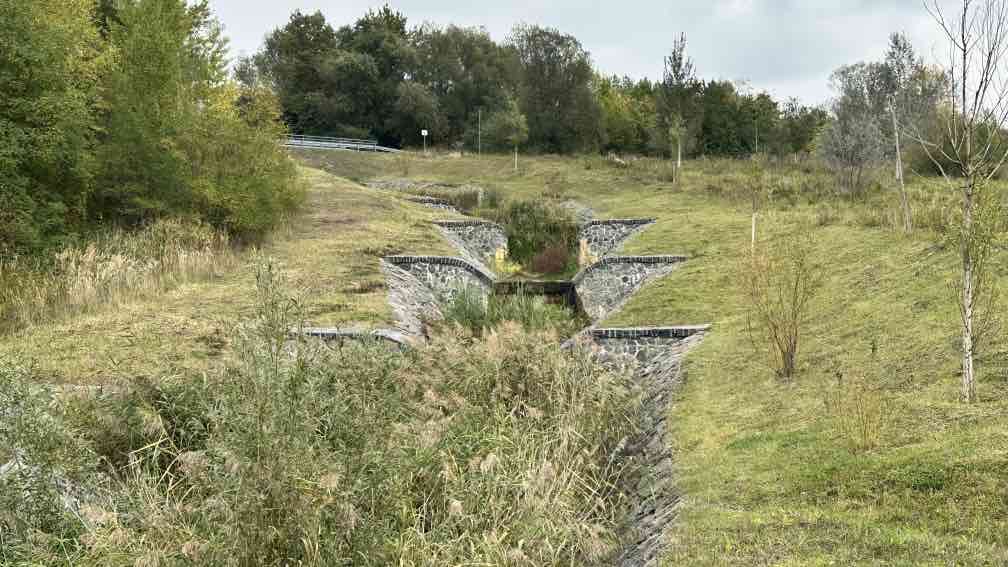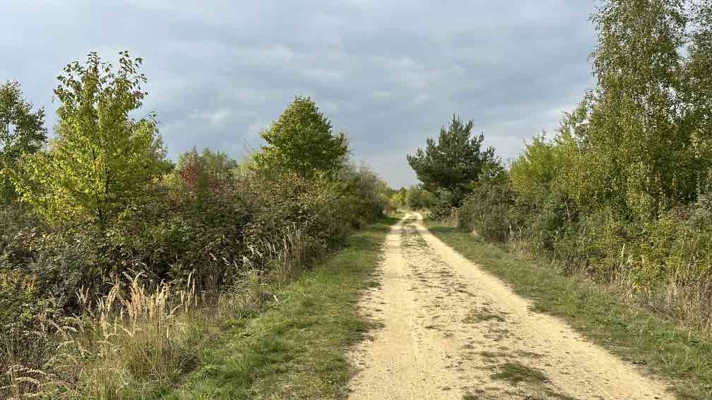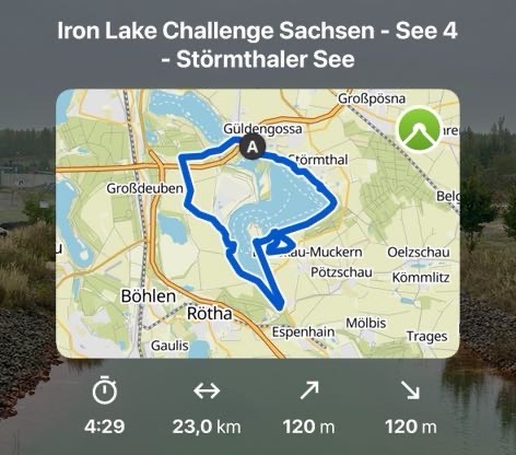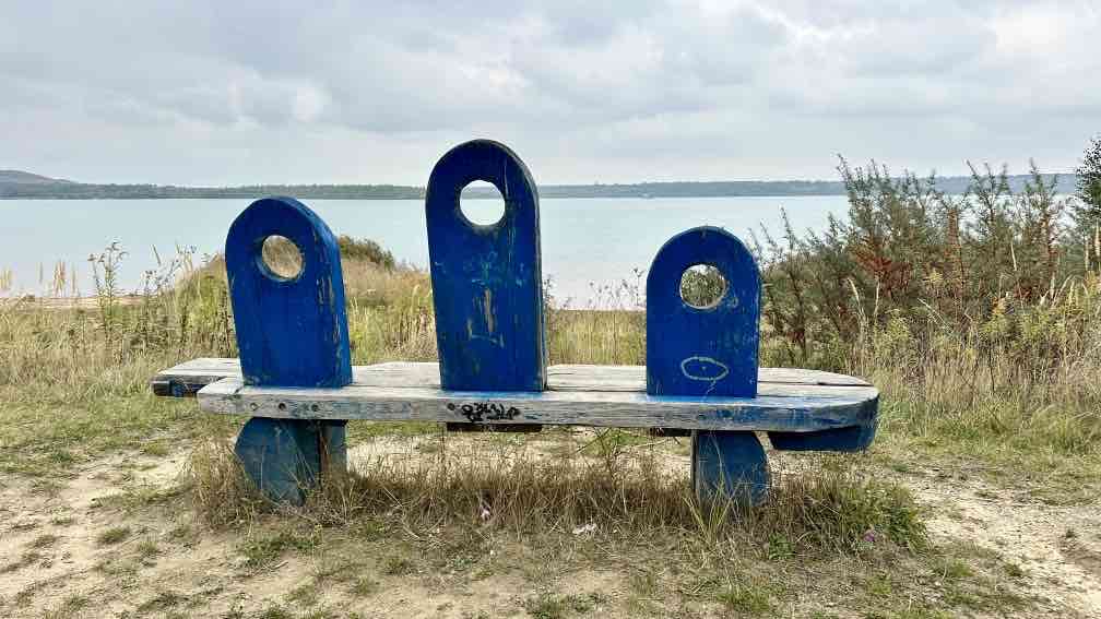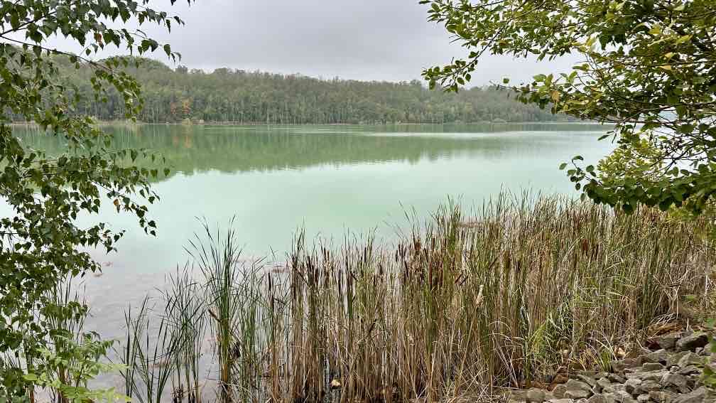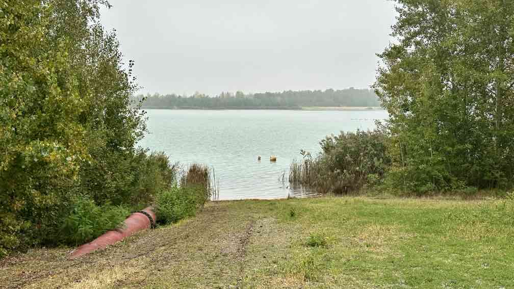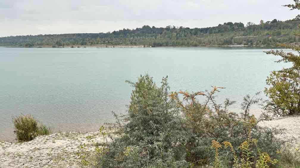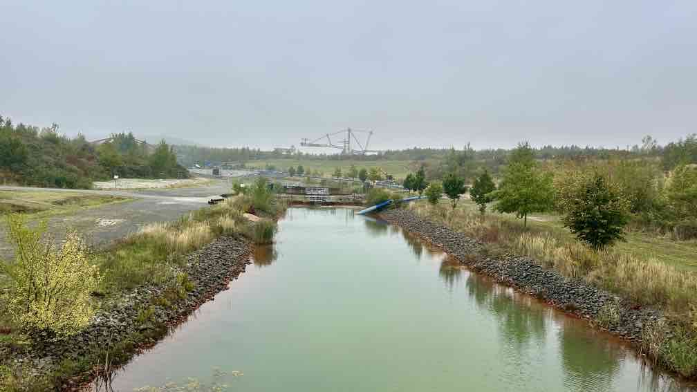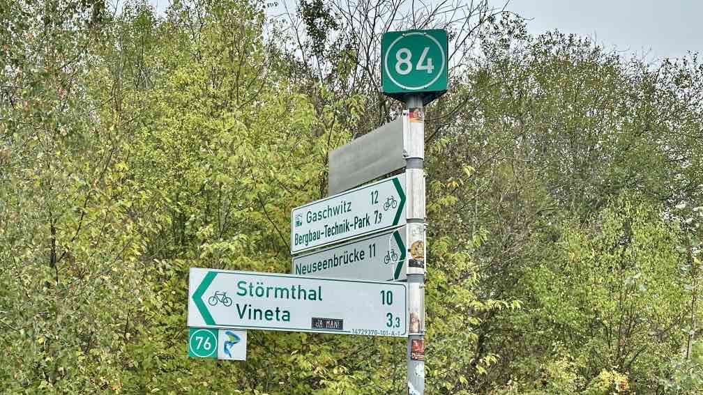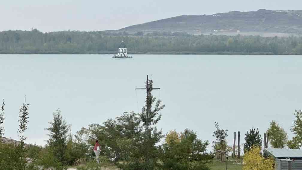 „Gefahrenabwehrmaßnahme“! Auch hier scheint es also Sanierungsmaßnahmen zu geben. Ich beginne einen Umweg, später gibt es die nächste Sperrung. Umleitung für Radfahrer und Fußgänger. Und so laufe ich eine weite Strecke über Felder, über die Autobahnbrücke, immer auf Asphalt oder Split. Und erst nachdem ich schon die Hälfte der heutigen Tour geschafft habe, gestattet mir der See, fast direkt neben ihm zu laufen. Schade, dass es heute so diesig ist, feuchte Luft, keine Sonne. Das hindert mich aber nicht, im Hafen von Lagovida auf einer Bank eine schöne lange Pause einzulegen. Danach bin ich allerdings arg durchgefroren, ziehe eine weitere Jacke aus dem Rucksack über. Mich überholen oft Radfahrer, aber Wanderer sehe ich keine. Dafür erkenne ich in der Ferne das Kraftwerk Lippendorf, die Vineta auf dem See – sie symbolisiert die verlorene Magdeborner Kirche und ist ein schwimmendes Mahnmal, aber auch ein Event-Ort für Hochzeiten und Kultur – , das Schiff „Wachau“ auf seiner Rundfahrt und auch die große Förderbrücke im Bergbau-Technik-Park. Diesen Park samt der daneben liegenden Zentraldeponie Gröbern – einem Berg, der bis 2026 weiter auf 196 Meter anwachsen wird – habe ich nur aus der Ferne gesehen, da die Umleitung zu Beginn weitläufig daran vorbei führte. Ja, dieser See ist wieder ein Tagebausee, der seit 2001 den ehemaligen Tagebau Espenhain füllte, aber ich fand ihn schon recht „laufenswert“, da er nicht so geradlinig, so quadratisch wie manch anderer Tagebausee daherkommt. Und man konnte in der zweiten Hälfte auch oft auf Pfaden wandern und nicht immer auf dem Radweg. Viele schöne Bänke laden zum Ausruhen ein, nur leider war dafür heute das Wetter nicht richtig geeignet. Vielleicht kommen wir in zwei Jahren wieder her, den 100. Geburtstag von der Mama auf Vineta feiern …
