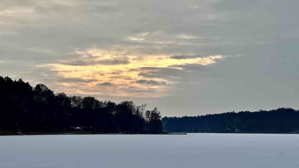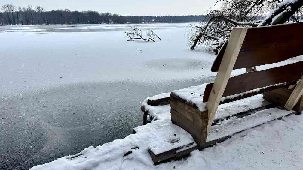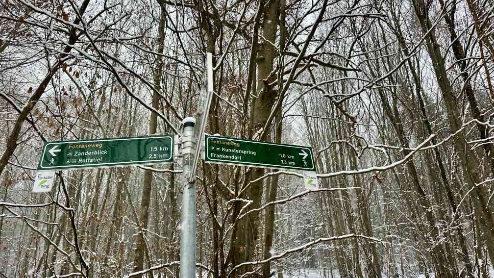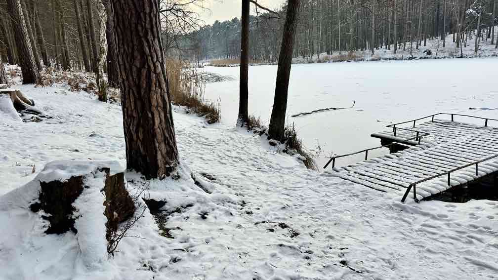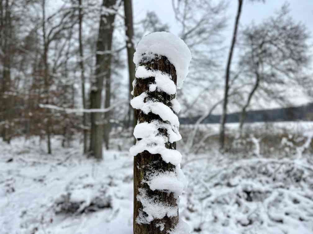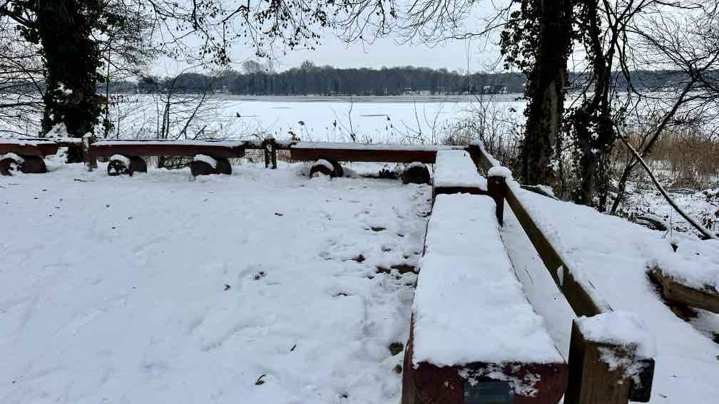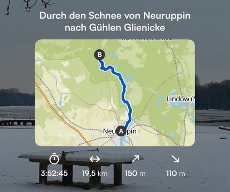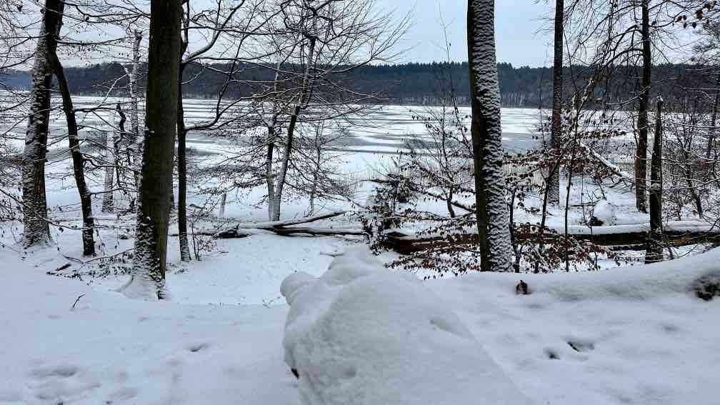 Nach einem Termin in Neuruppin bietet es sich an, eine Wanderung dranzuhängen. Bei den Wetterverhältnissen wähle ich einen ordentlichen Wanderweg, denn vom Bus aus habe ich schon gesehen, dass hier mehr Schnee als in Rheinsberg liegt. Also führt mich mein Weg zuerst am Ruppiner See – auf leicht vereisten Wegen – entlang und dann rüber nach Molchow – größtenteils Straße, dann ein schöner Uferweg. Von da aus sind es nun Waldwege, die zwar eine Schneedecke haben, aber nicht glatt sind. Trotzdem achte ich auf jeden Schritt, habe keine Lust mich hier „retten“ lassen zu müssen. Ziel ist Kunsterspring. Wunderschön sehen die schneebedeckten Tannen aus. Ein seltener Anblick hier in der Ruppiner Schweiz. Inzwischen fängt es sogar wieder an zu schneien. Es soll heute Abend wohl noch richtig ungemütlich werden. Also los jetzt, weiter. Leider war ich zu schnell unterwegs, der geplante Bus fährt erst in einer knappen Stunde. Oder zu langsam, der vorhergehende Bus fährt an mir vorbei, als ich aus dem Wald komme. Also packe ich noch ein kleine Strecke hinten dran, denn bei der Kälte möchte ich nicht an der Haltestelle rumstehen und warten. Und so endet meine Winterwanderung einen Ort weiter. Bei der nächsten Tour im Schnee nehme ich Stöcke mit …