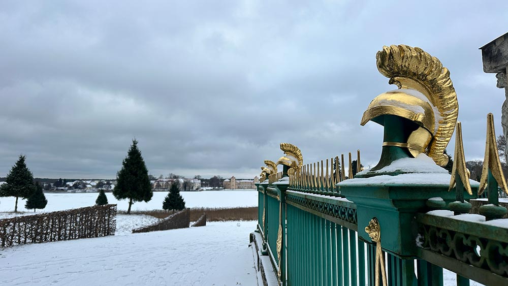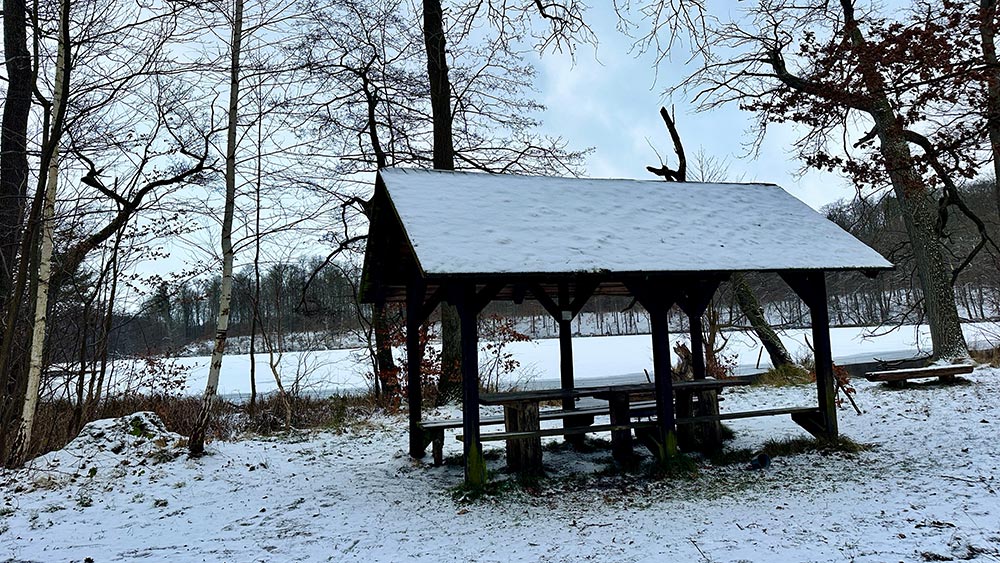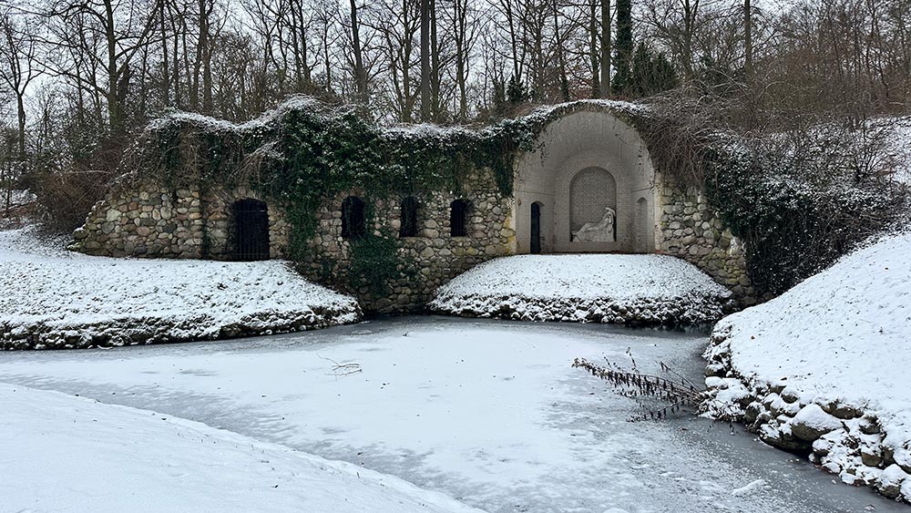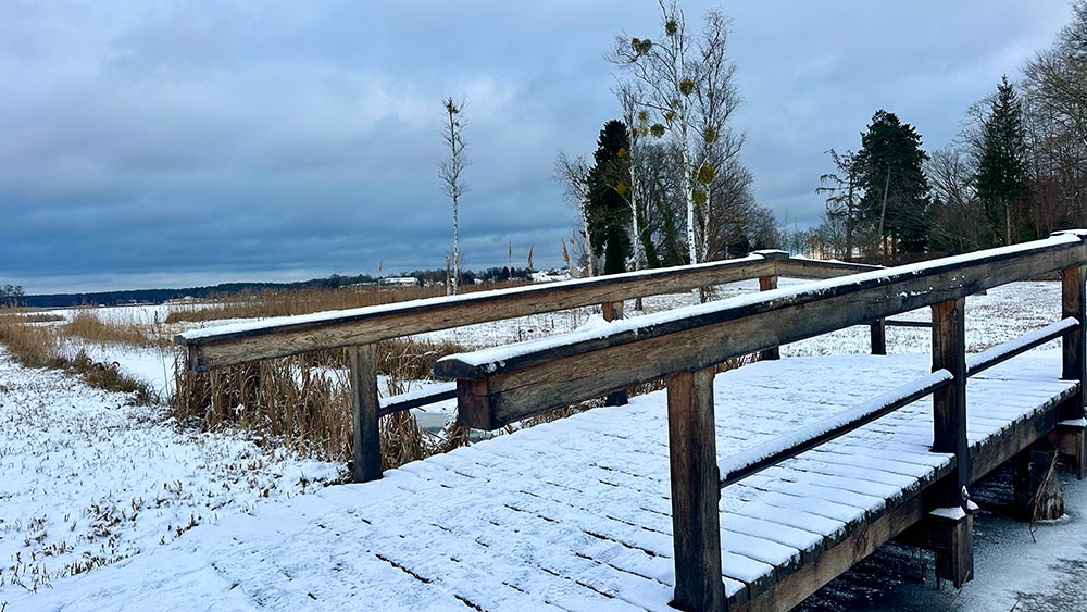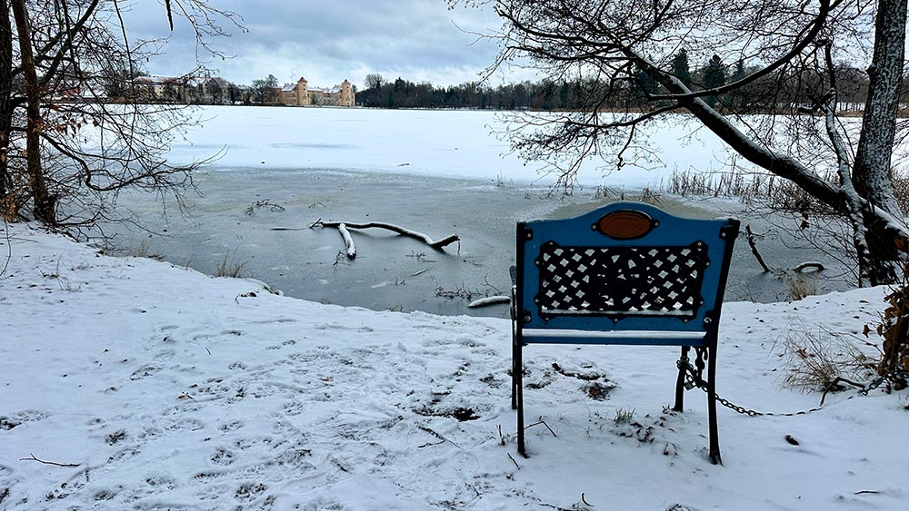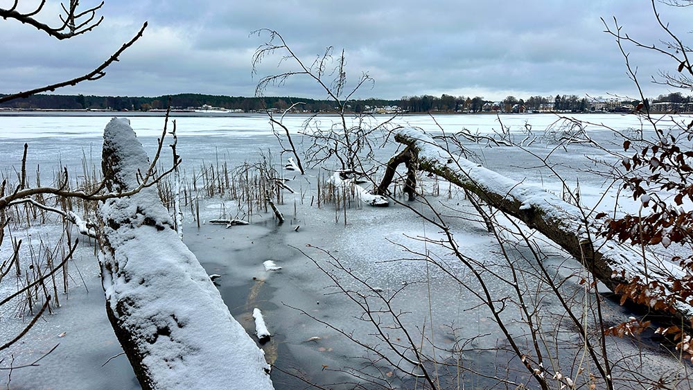Ich habe so der Wetter-App vertraut, um bei frischen Schnee und Sonnenschein ein paar Fotos für meinen nächsten Panoramakalender 2027 einzusammeln. Aber nichts war, kein einziger Sonnenstrahl, kein weißer Pulverschnee. So wird es eben „nur“ eine kleine frostige Runde durch den Schlosspark und den Boberower Wald. Auch schön …