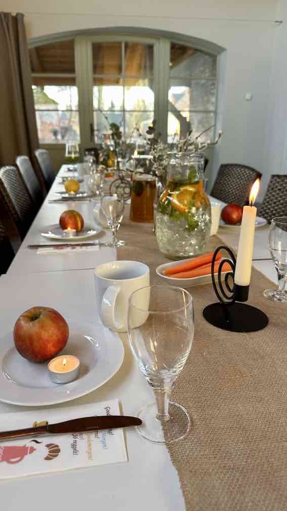 Ein wunderschön dekorierter Tisch erwartet uns. Für die Fastenbrecher gibt es den ersehnten Apfel, für alle, die noch ein, zwei Tage dranhängen wollen, steht ein Saft bereit. Ich gehöre zu den Ersteren. Schließlich habe ich schon fünf Tage vorher gefastet, insgesamt 10 Tage reichen nun. Carina hat wie jedes Jahr viele Fotos zu einem kleinen Film zusammen-gestellt, den wir uns gemeinsam anschauen. Lustig, nachdenklich, wunder-schön. Dann genießen wir unser Frühstück in aller Ruhe, jeder geht in sich. Anschließend berichten wir uns gegenseitig, was uns gefallen hat, was wir aus dieser Wochen mitnehme. Es wird teilweise sehr emotional, jeder hier ist begeistert. Unsere Fastenleiterin Carina hat wie immer einen tollen Job abgeliefert. Ebenso wie ihre Mitstreiterinnen für Yoga, Massage und unser 84-jähgriger Koch.