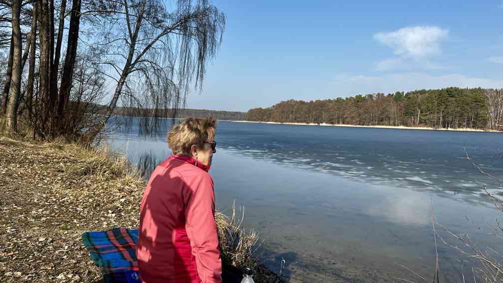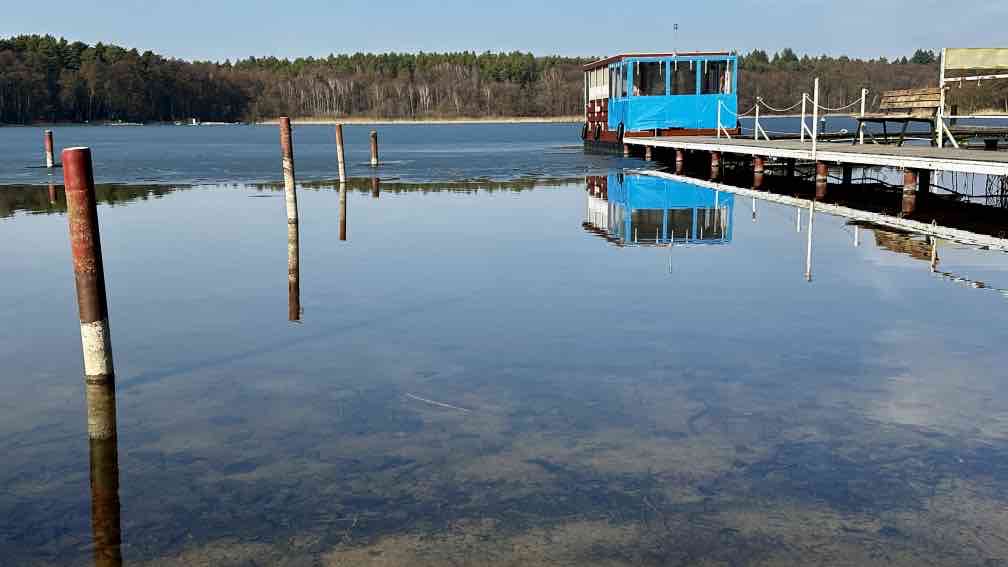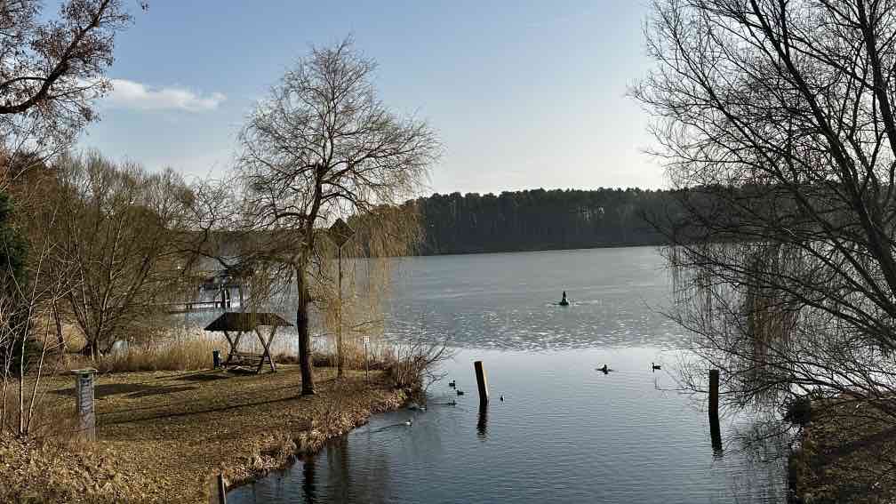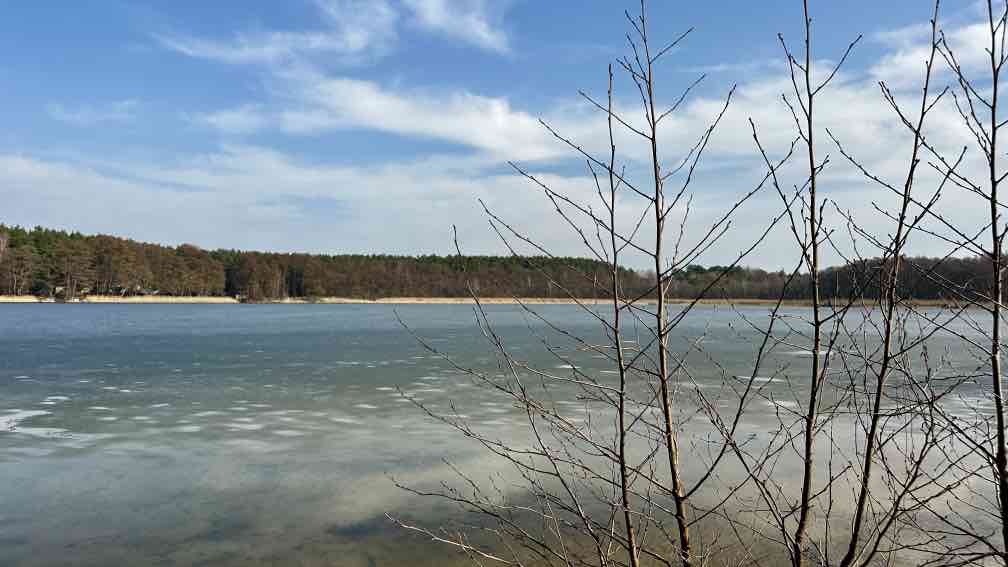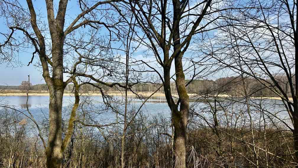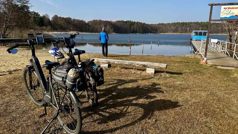 Ich bin wieder zuhause und habe die Sonne mitgebracht. Nein, auch hier hat sie letzte Woche unentwegt ihr Bestes getan. Langsam, ganz langsam beginne ich nach dem Fasten wieder zu essen – und wichtig, Bewegung tut dabei gut! Also schwingen wir uns aufs Radl und unternehmen eine (längenmäßig)recht kurze, aber(zeitlich) recht lange Rundtour. Erster Halt – am Strand von Beckersmühle. Im Garten vom Hotel Gutenmorgen tummeln sich unzählige (mit Reisebussen hergeschaffte) Ausflügler und lauschen den Live-Volksmusikklängen. Wir dagegen setzen uns an den einsamen Strand, mit uns nur eine Handvoll Gäste, die keinen Bock auf Musik haben, sondern wie wir auf den See hinausblicken. Immer noch ist er fast zugefroren. Nächster Stopp ein paar Kilometer weiter, auf der Halbinsel mit der TietzowseeFerienhaus-Siedlung bei Zechliner Hütte, auch wieder am Strand, auch der See ist noch recht zugefroren. Aber hier sind wir tatsächlich allein, von den vielen Finnhütten scheinen nur ein-zwei belegt zu sein. Hinten auf dem Eis tippelt eine Bachstelze, in der Ferne (ich habe gelernt, nicht schimpft, sondern:) lacht ein Grünspecht, die Spatzen zwitschern in der Hecke (ich habe gelernt, da gehen die sozialen Kontakte ab), die Sonne wärmt uns den Rücken. Einfach nur himmlisch. Ohne Umwege radeln wir von da zurück nach Rheinsberg, halten kurz am Schloss und bestaunen den vollen Biergarten vom Ratskeller genau gegenüber. Was der Frühlingsanfang so bewirkt …